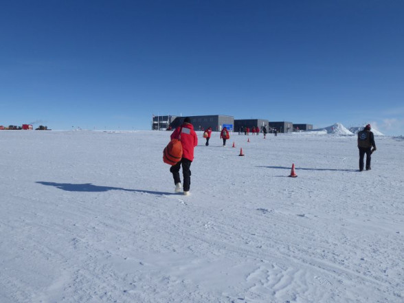 Shortly after Christmas, a long journey begins for two scientists of our institute to a place, where the sun always shines. At South Pole, the Sun rises in September and sets in March. However, atop Earth's largest ice mass, the temperature is nothing but comfortable (today's forecast is -32°C). The first activity after arriving in Christchurch, New Zealand is therefore the outfitting with clothes suitable for extreme weather. This includes thermo undergarments, a mid layer of thick fleece, an outer layer of wind-proof and lined trousers, and parka that you can't buy in a shop. The outfit is completed by shoes, gloves, mittens and, of course, sun glasses.