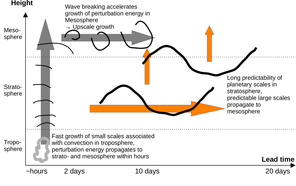 The atmosphere is a complex and chaotic system, and therefore, atmospheric circulation cannot be predicted indefinitely in advance. For weather in the lower atmosphere (the troposphere) this is well studied: the limit of weather predictability is about 10 days to two weeks. Far less is known, however, about the predictability of higher atmospheric layers.