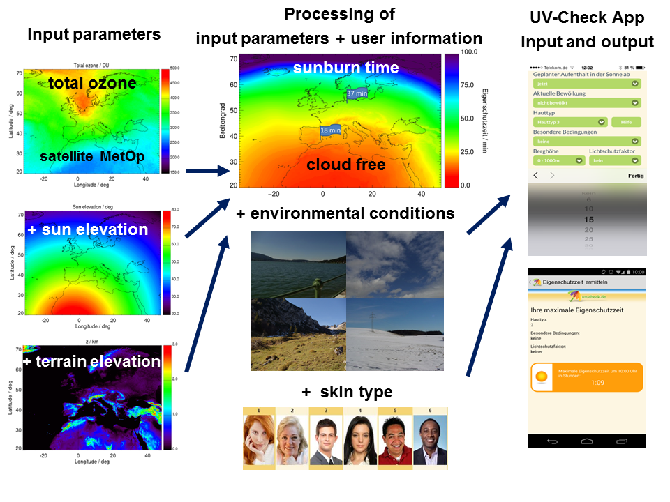 By means of radiative transfer simulations an efficient procedure for the calculation and mapping of near surface UV radiation has been generated at the DLR Institute of Atmospheric Physics. This procedure serves as the core of the UV-Check service which has been developed in cooperation between the Institute of Atmospheric Physics and the Berufsverband der Deutschen Dermatologen (BVDD). UV-Check has been made available to the user as smartphone APP and internet service. The service enables a user to quickly request his individual sunburn time at every time and every location within Europe.