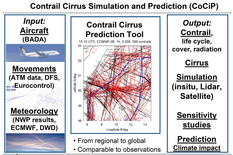 The tool allows for efficient contrail simulations even globally. The method has been tested for some case studies with comparisons to observations. The most critical input parameter is the NWP humidity field. The results compare favourably with observations and support interpretations of insitu, satellite and lidar observed aviation impact on cirrus clouds. CoCiP can be used to predict and minimize the climate impact of contrails.
