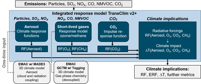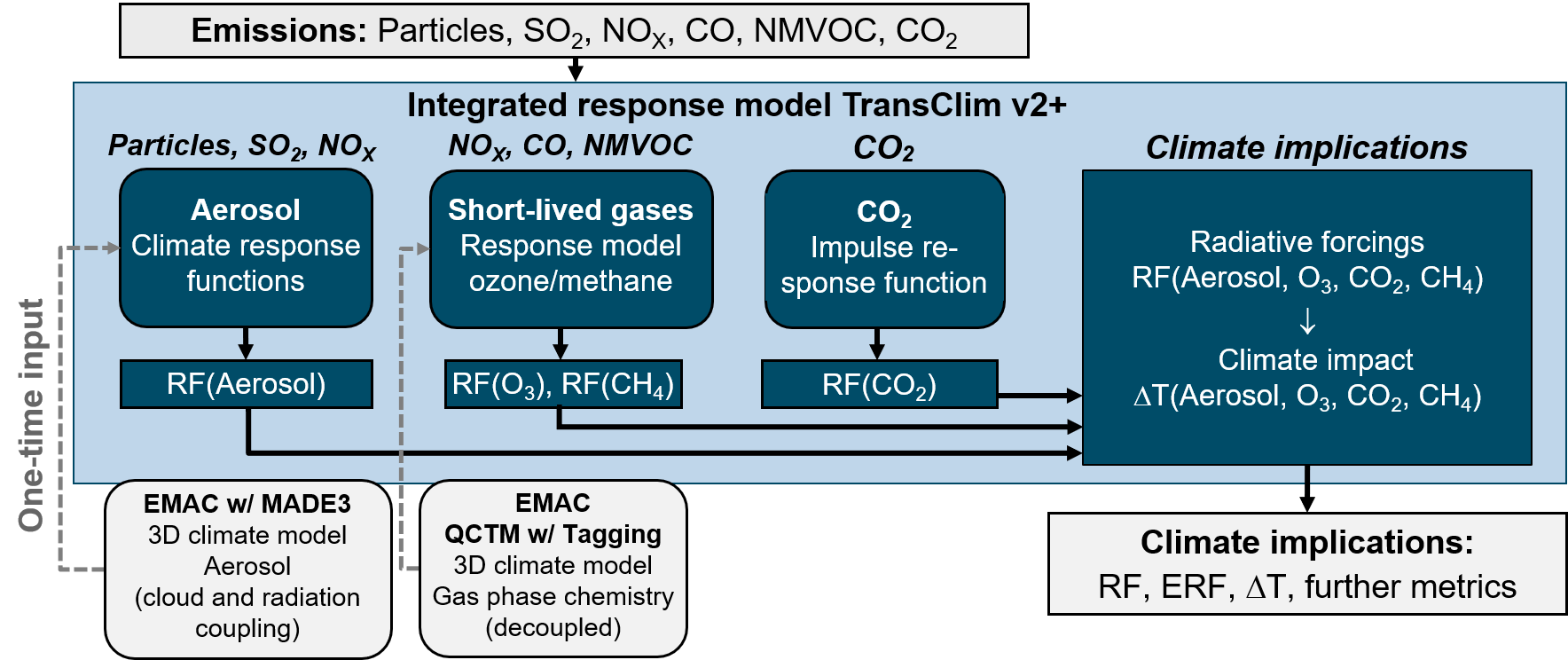 Schematic illustration of TransClim, status: May 2025. In addition to the published versions (see “Links”), the current version also includes aerosol and CO₂ effects, and an updated treatment of the forcing via perturbation of the atmospheric CH₄ residence time. Abbreviations: SO₂ – sulfur dioxide, NOₓ – nitrogen oxides (NO₂, nitrogen dioxide + NO, nitric oxide), CO – carbon monoxide, NMVOC – non-methane volatile organic compounds, CO₂ – carbon dioxide, RF – radiative forcing, ΔT – temperature change, MADE3 – name of aerosol submodel, QCTM – quasi chemistry transport mode (without feedback of chemistry on atmospheric dynamics), ERF – effective radiative forcing (including fast adaptations of the atmosphere like cloud formation).
