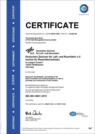 Zertifikat 45001_en.pdf (PDF / 176KB)Research, development, and testing in the field of launcher and rocket propulsion as well as planning and construction of test facilities.