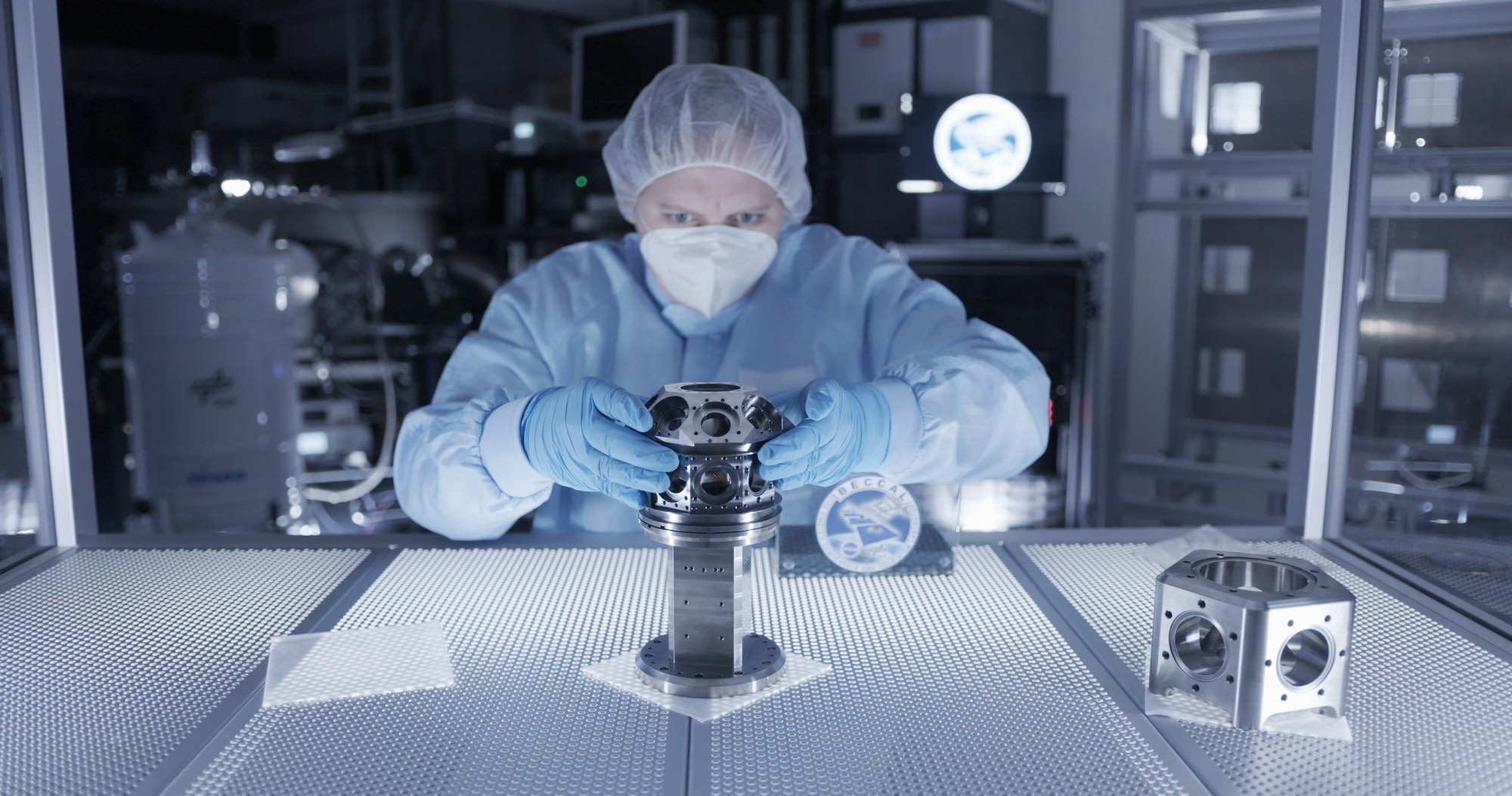 Lisa Wörner from the Institute of Quantum Technologies with elements of the Bose Einstein Condensate and Cold Atom Laboratory (BECCAL): Together with NASA, DLR is investigating ultracold quantum gases and condensed atoms – on Earth and in microgravity on the ISS – and is thus creating the conditions for basic research and the development of future quantum sensors.