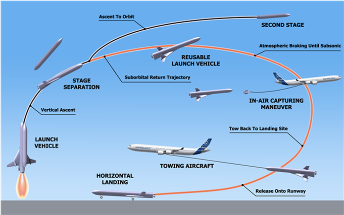 After a rocket launches and its second stage separates, continuing its ascent into space, the first stage falls back to Earth. Thanks to its design, it enters into horizontal flight and decelerates to a subsonic speed, approaching and then docking with an aerodynamic capture device mounted on an aircraft. It is then towed to the landing area.