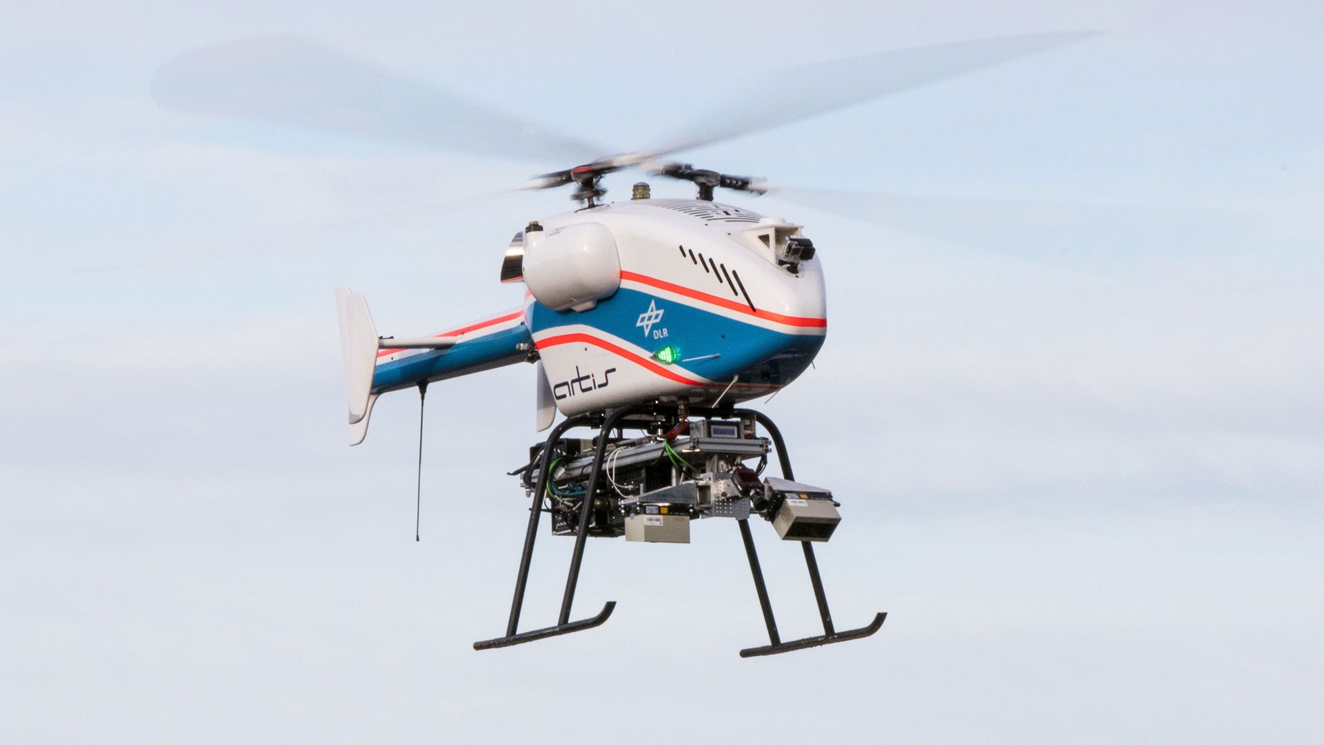 DLR's small and uncrewed superArtis helicopter in flight with payload