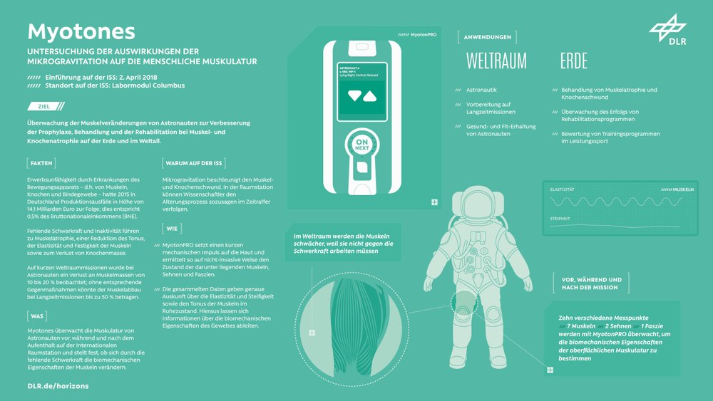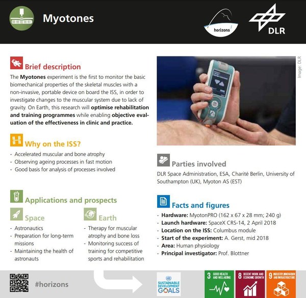 The Myotones project aims to analyse the basic biomechanical properties of the skeletal muscles in a non-invasive way, using a small, handheld device. With MyotonPRO, changes in human resting muscle (tone, elasticity and rigidity) caused by lack of gravity are measured and evaluated for astronauts onboard the ISS. The technology has already been successfully applied in bed rest studies; moreover, the device has already proven to be suitable for taking measurements under microgravity during parabolic flights.
