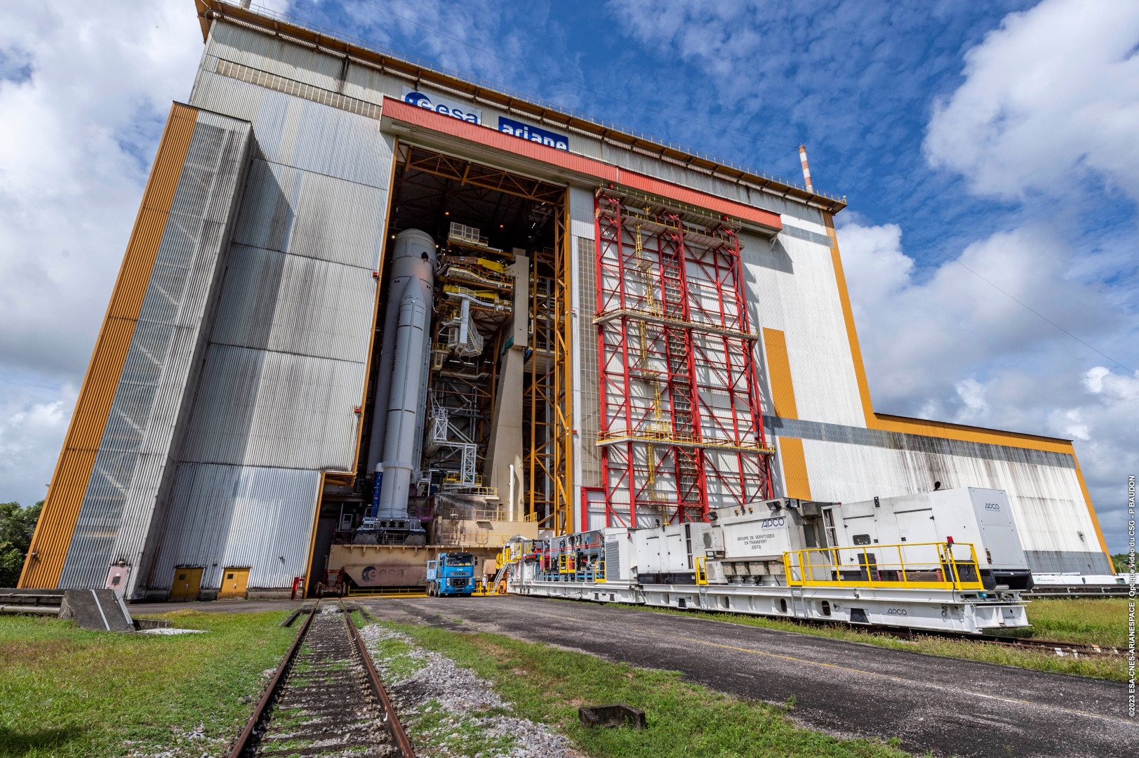 After the JUICE probe has been integrated into the launch vehicle, it is moved on rails from the assembly hall to the launch pad.