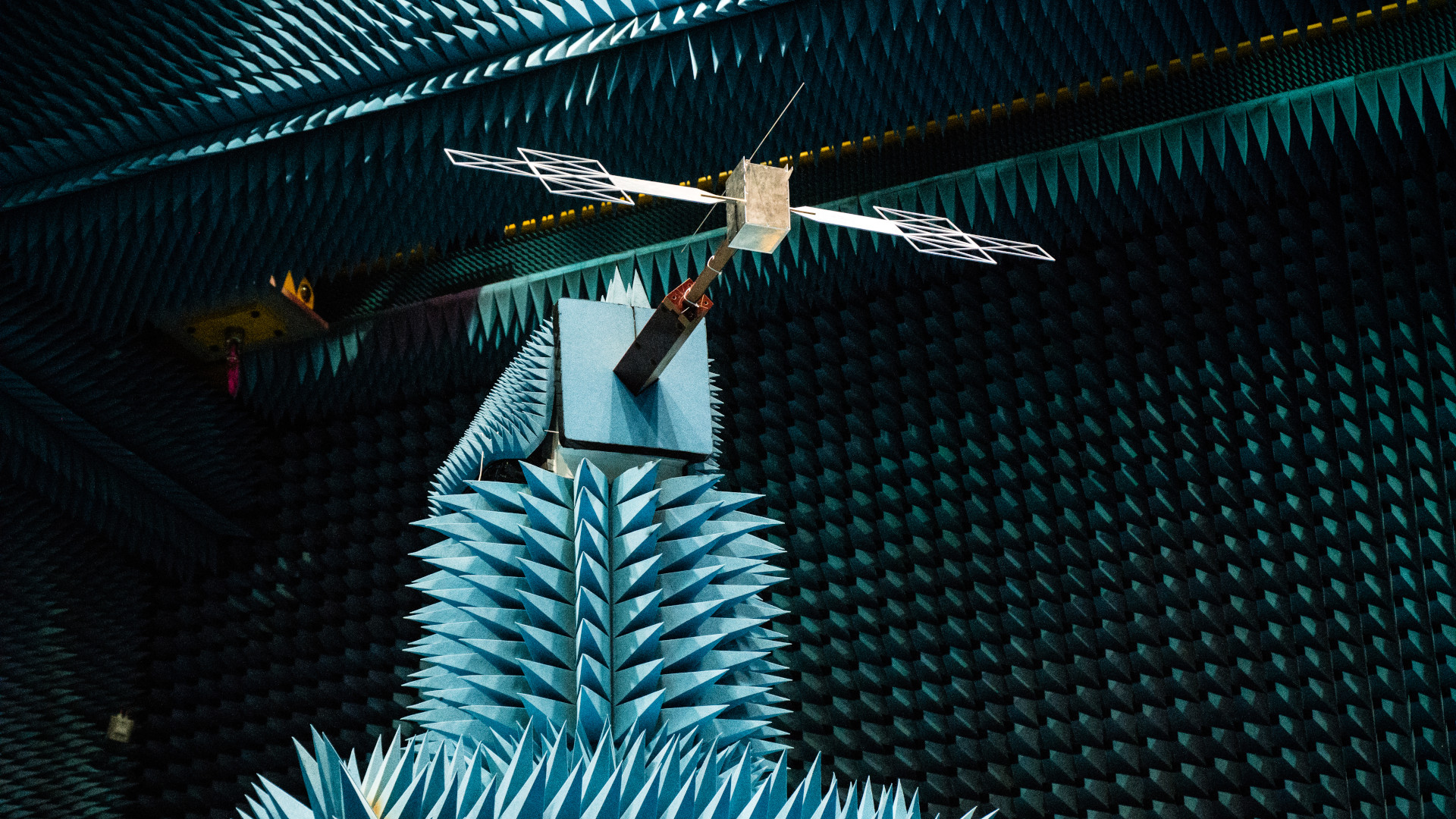 A 1:18 scale model of the RIME dipole antenna for the JUICE mission, mounted on a simplified spacecraft model during tests in the Hertz facility at the European Space Research and Technology Centre (ESTEC) in Noordwijk, the Netherlands. The thin, forward and backward pointing rod has a length of 16.6 metres. RIME is an ice penetrating radar designed to study the subsurface structure of Jupiter’s large moons from a distance.