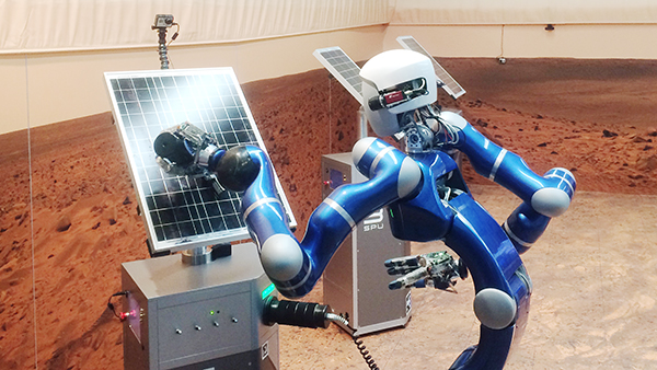 Tingle, who was viewing the working environment on the Red Planet through Justin's eyes on his tablet, quickly realised that Justin needed to clean the panels and remove the dust. And he also had to realign the solar components. To do this, he could choose from a range of abstract commands on the tablet. “Our team closely observed how the astronaut accomplished these tasks, without being aware of these problems in advance and without any knowledge of the robot's new capabilities," says DLR engineer Daniel Leidner. The new tasks also posed a challenge for Justin. Instead of simply reporting whether he had fulfilled a requirement or not, as in the initial test run in August 2017, this time he and his operator had to ‘estimate’ the extent to which he had cleaned the panels, for example. In the next series of experiments in summer 2018, the German ESA astronaut Alexander Gerst will take command of Justin – and the tasks will again become slightly more complicated than before because Justin will have to select a component on behalf of the astronaut and install it on the solar panels.