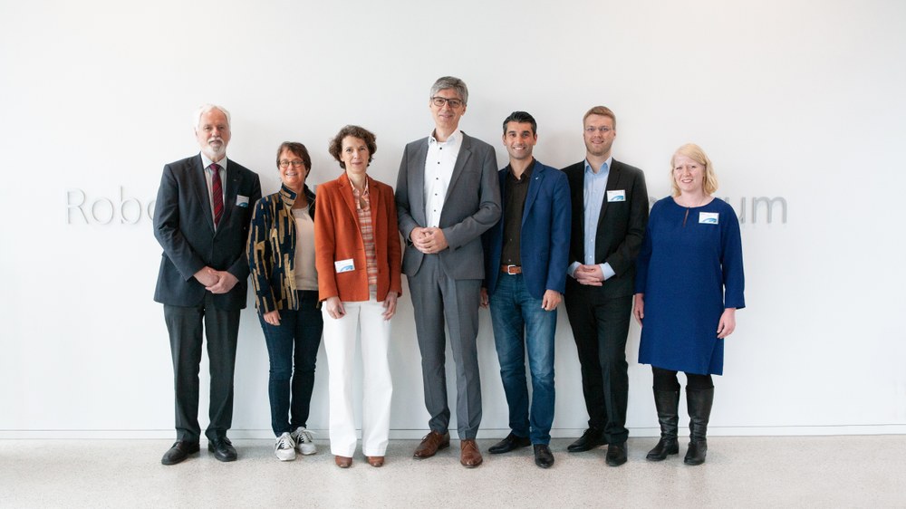 Following a tour of the laboratory, the staff members of the DLR institute presented the research work of the Factory of the Future on the basis of detailed demonstrations. In addition to the determined task, the new DLR lightweight robot SARA also learns and reproduces the required strength after being instructed by the worker. Another demonstrator shows the autonomous assembly of individual products, which is aimed above all at ease of use: Product configurations are entered using a tablet PC – the robot system simply assembles these according to specifications. In mobile manipulation, the combination of a manipulator with a mobile platform expands the working space: This increases mobility and flexibility, especially in the area of fetch-and-carry operations in an industrial environment. In the Collaborative Workcell, the focus is on intuitive robot programming – and thus on humans and robots working together safely. This gave the participants a major insight into the work of the Factory of the Future research project.