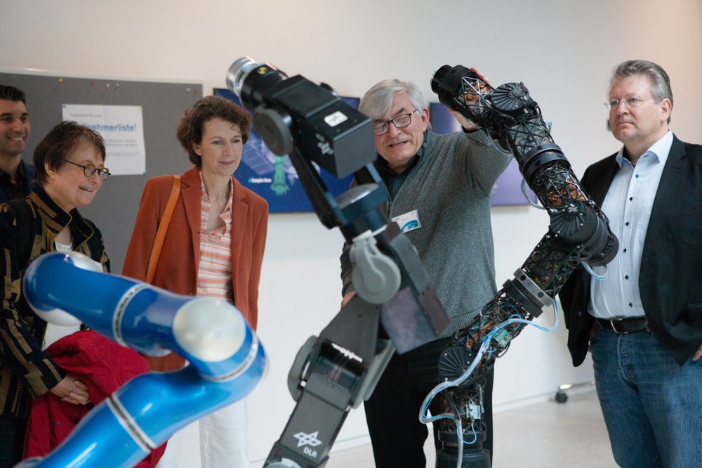 In cooperation with the Chamber of Industry and Commerce for Munich and Upper Bavaria (IHK), the Research for Breakfast event took place on April 9, 2019 at the DLR Institute of Robotics and Mechatronics. The series of events by the IHK aims to introduce research institutions from the region and their work to companies and interested parties. After brief keynote speeches, the main focus is on visiting the respective research laboratories and the dialogue between research, industry and interface facilities. This year, the focus is on research activities in the field of man and machine.