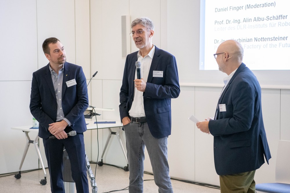 The event was organised to mark the successful conclusion of the joint project "Factory of the Future - Extended", in which several DLR research institutes were involved. Speakers from industry spoke about trends and industry requirements for robotic solutions and innovative components for future production. Numerous contributions from researchers - in the form of short presentations and an internal exhibition - provided innovative designs for these challenges. The variety of topics ranged from autonomous, flexible production networks, intuitive robot programming and virtual commissioning to robot-assisted inspections in maintenance and hybrid manufacturing. Participants were able to experience DLR's latest developments up close during two guided tours of the research laboratories.