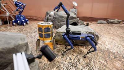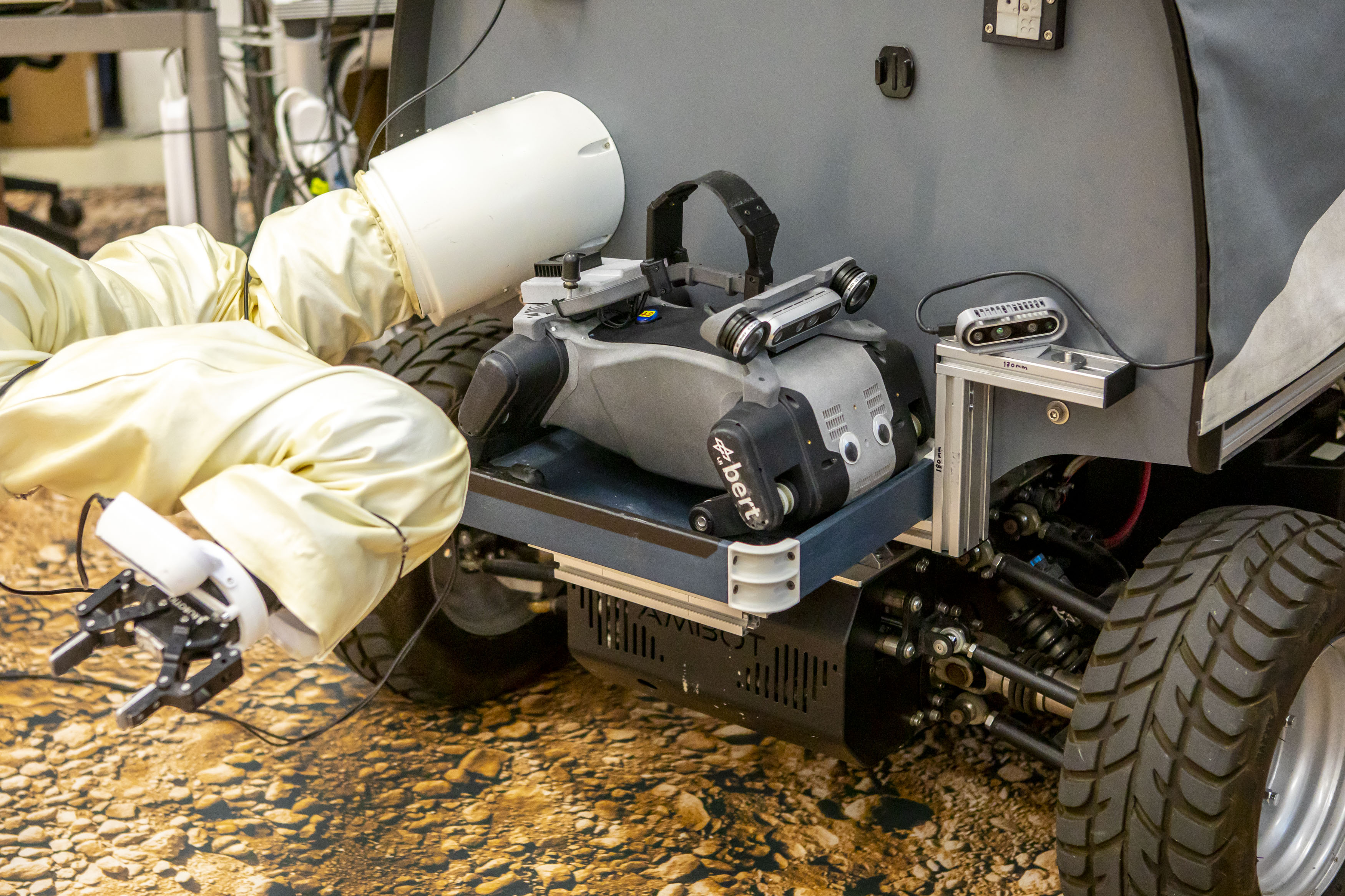 Spot is taller than Bert and equipped with a gripper arm. Jonny Kim gave him the task of independently finding the sample containers on display and bringing them to the transfer station. The NASA astronaut then switched directly to the Rollin' Justin robot with the task of taking the incoming containers from the transfer station to the lander. The two robots independently collected several "Mars samples" for transport back to Earth, while the astronaut was able to devote himself to the next tasks.