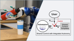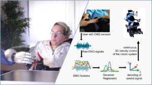The mobile robot EDAN (EMG-controlled daily assistant) is an assistive robotic system for people with severe motor impairments. Through the control of muscle signals and integrated shared autonomy, everyday tasks, such as drinking from a glass or opening a door, are made possible.