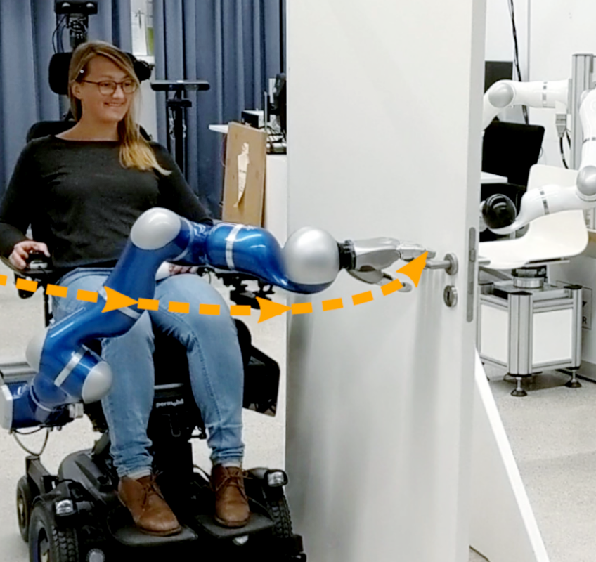 Injuries, accidents, strokes and other diseases can significantly impair the ability to perform even the simplest activities of daily living. In some cases, people can no longer manage their daily lives independently and rely on 24-hour care. In this situation, assistive technology, such as a robotic arm mounted on a wheelchair, can provide help and relief. Thus, in the Re-Enabling Robotics group, we are investigating how such assistive robotics technology can support people with physical disabilities. Following this goal, our research is twofold: On the one hand, we explore novel human-machine interfaces that enable people with severe physical disabilities to control assistive systems. On the other hand, we develop methods for autonomous and semi-autonomous control concepts that allow intuitive use of an assistance robot and provide intelligent support in performing everyday activities. We combine all these methods in our wheelchair-based assistive robot system EDAN (EMG-controlled Daily Assistant), which consists of a power wheelchair equipped with a DLR lightweight robot. This system is supposed to enable people with severe physical disabilities to perform simple daily tasks such as drinking or opening doors independently.