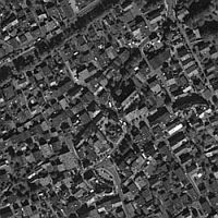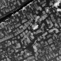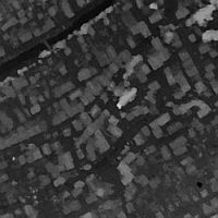 You can see results on the right-hand side. The image at the top is a small part of larger imagery from an airborne linear pushbroom camera (HRSC). Depth images are seen in the middle and at the bottom. The lighter the gray tone, the higher the pixel is over the ground. The image in the middle shows results of the currently used hierarchical, correlation based stereo algorithm. It can easily be seen that the sharp borders of houses are blurred. The image at the bottom shows results of the new method, which are much sharper at object boundaries.