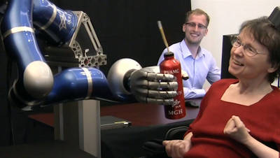 - For people with more severe disabilities, e.g. after spinal cord injury or stroke, we investigate the use of cortical interfaces, which record neural activity directly from the brain, based on the Braingate2 Neural Interface System developed at Brown University. Using this implantable BCI, we could enable a person with tetraplegia to control the DLR LWR-III ([2], [3]). In our collaborative study, a participant was able to control the robotic system and autonomously drink from a bottle for the first time after she suffered a brainstem stroke 15 years earlier.