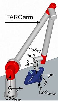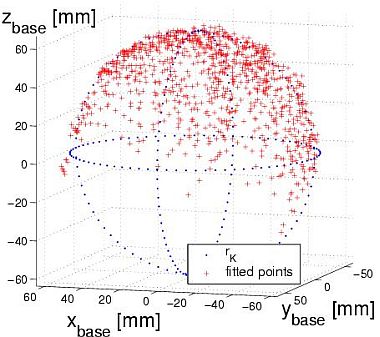 For the calibration of the laser-range scanner on the tcp, we only need to determine the parameters describing the transformation from CoSsensor to CoStcp, because neither distortion nor scaling parameters need estimation. Our attempt is to measure data points on the surface of a sphere with given radius at arbitrary centre, with the laser-range scanner synchronously with the tcp pose delivered by the pose sensor. For this estimation step we use the Levenberg-Marquardt method, a widespread optimization method for nonlinear least square problems. It is a smooth combination between the Inverse-Hessian Method and the steepest descent method. A merit function has to be formulated. Its minimization delivers best-fit parameters for our problem of calculating the constant transformation between the sensor and the tcp.