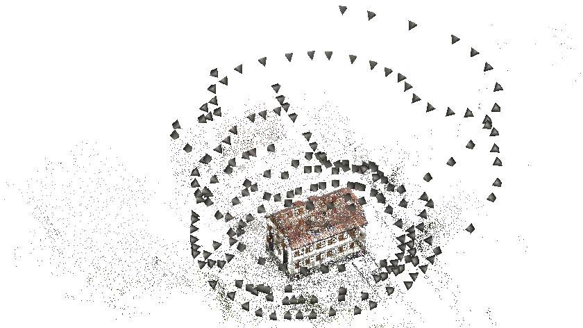 Second, depth images are derived using semiglobal matching [2]. For each pixel, we try to determine the distance from the object to the camera. The depth images are merged to 3d-points [3], which are triangulated in order to reconstruct the object's surfaces [1]. It is possible to obtain reconstructed settlements with small details at single buildings, if the images have a high resolution and largely overlap each other, cf. the railing of the stairs in Figure 2.
