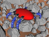 The kinematics of the rover is based on six dexterous four-joint fingers from DLR robot hand II. The fingers, here used as legs, are attached to a central body in a beetle-like configuration and enable the overall system to manoeuvre in a rocky terrain (e.g., planetary surface). Moreover, since all of the joints are equipped with force/torque sensors, the rover’s motion can be very sensitive.