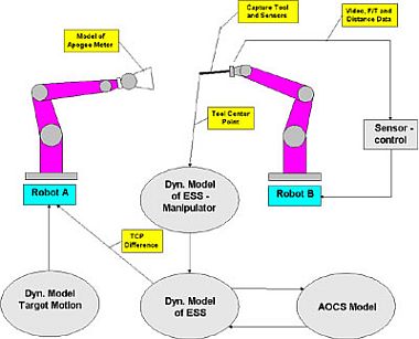 An interface to the simulation of the AOCS (Attitude and Orientation Control System) emulated the behaviour of the entire ESS under space conditions. A special, in-house-developed capture tool, containing 6 laser range finders, a wrist-mounted force-torque sensor, and a stereo camera pair, allowed, in combination with the dynamics behaviour prediction, the fully autonomous servoing, insertion, and capturing of the apogee motor nozzle, which is typical for any geostationary satellite. We simulated the visual servoing phase in the lab by the above-drafted two-robot system. One robot carries a satellite mockup with an original-sized apogee nozzle, performs a typical tumbling motion of a rigid body under zero gravity, and superimposes the computed dynamic interactions of the service robot with its (possibly) free-floating base. Thus in the lab the service robot (a second robot) is inertially fixed and tracks the satellite in order to capture it by inserting the capture tool into the apogee motor. The approach of the target satellite is controlled by real-time, model-based machine vision. Once contact between capture tool and apogee motor has been established, force/torque-sensing takes over. In both phases all Cartesian degrees of freedom are being controlled.