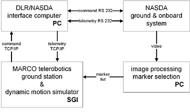 To check and test our interfaces as well as our MARCO control system within the ETS-VII scenario, an on-line simulator was developed, which emulated the remotely operated robot, its command interfaces and its environment. The simulator is able to emulate all different modes, the timing, the environmental interactions, and the prediction of the satellite’s attitude while moving the robot arm. This kind of simulation has turned out to be very useful for proofing software correctness while interacting with the tele-robot.