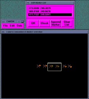 After 3 cycles (with a = 1), the target pose was reached. To extract the markers from the video image a blob-finding algorithm was used. Because this algorithm delivered more „markers“ as desired, e.g. due to bad illumination conditions, the markers were interactively selected and the resulting control command was verified before sending it to the real robot. The figure above shows the simulated(_) and the real(X) markers, with the interactive selection frame.