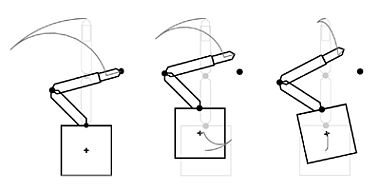 As long as the tasks performed with the robot are described in robot-fixed coordinates, the fact that the satellite position remains uncontrolled has no influence. If, however, the task is described with respect to an orbit-fixed co-ordinate system, as it would be the case for example for the capturing of another defective satellite, the robots satellite motion has to be taken into account (see Figures). The equations relating the TCP motion to the manipulator joint motion, which for robots with an inertially fixed base are purely kinematic equations, therefore become dependent on dynamic parameters in the case of free-floating space robots due to the fact that the momentum equations are used to describe the satellite motion.