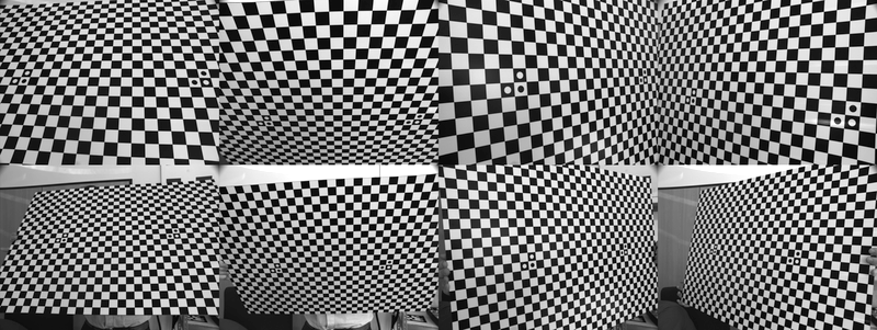 Calibration image set example composed of a eight images. Note that all images are tilted w.r.t. the calibration plate; note that at least the closest images (upper row) are filled with features; and note that the tilting angles are symmetrically distributed (up, down, right, left -- from left to right in the image). We usually take a second set of four images further away (bottom row) in order to further constraint the estimation of the relative position of cameras within a stereo camera rig (viz. the squint angle). In the case of monocular cameras, however, the upper four images suffice.