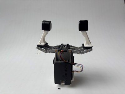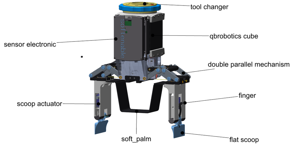 The Linear Scoop Gripper was developed as part of the Softenable EU project and is designed to grasp flexible objects such as fish or meat. Its special kinematics allow it to pick up flat objects from a table without the robot having to make a compensatory movement. This enables the two small scoops to slide underneath the object to be grasped. The scoops have two additional actuators that can be controlled via a sensor board. A flexible palm secures the object during transport. This version of the gripper was unveiled to the public at Automatica 2025.