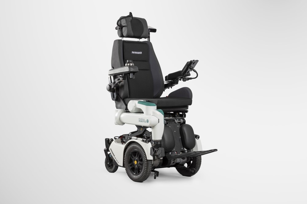 MAYA is an assistive robot designed to support individuals with severe motor impairments. Its seven-axis robotic arm is optimized for wheelchair integration, enabling users to pick up objects from the floor, operate in standing mode, and stow the arm compactly at the side of the wheelchair when needed.