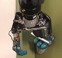 A new complex skill was added that allows the system to open and drive through a door. First the platform moves in front of the door with help of odometry and laser scanner localization. Then the vision system detects the door handle with a template matching approach. The matches from the three video images of the digiclops system deliver sufficient precise door handle localizations to securely approach and grasp the handle. After reaching contact with the hand the arm is put into a Cartesian impedance controlled mode based on a special potential function. During the move through the door hinge the arm has its virtual equilibrium position on a circular path relative to the base platform. There is not rotational stiffness set that means the orientation of the hand automatically adjusts. This approach allows opening the door without exact information about the doors size.