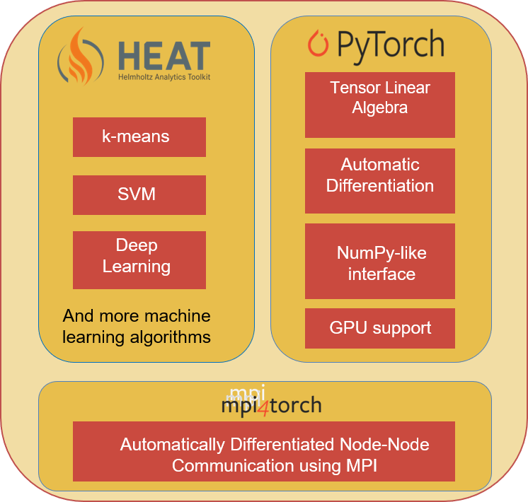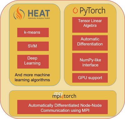 Heat is internally based on the open source software PyTorch, which is developed for machine learning. Heat extends the software with the aspect of data parallelism for mainframes of high-performance computing, using mpi4torch. The highly parallel algorithms support various Helmholtz applications in data analysis, for example in the area of high-speed images of rocket engines.