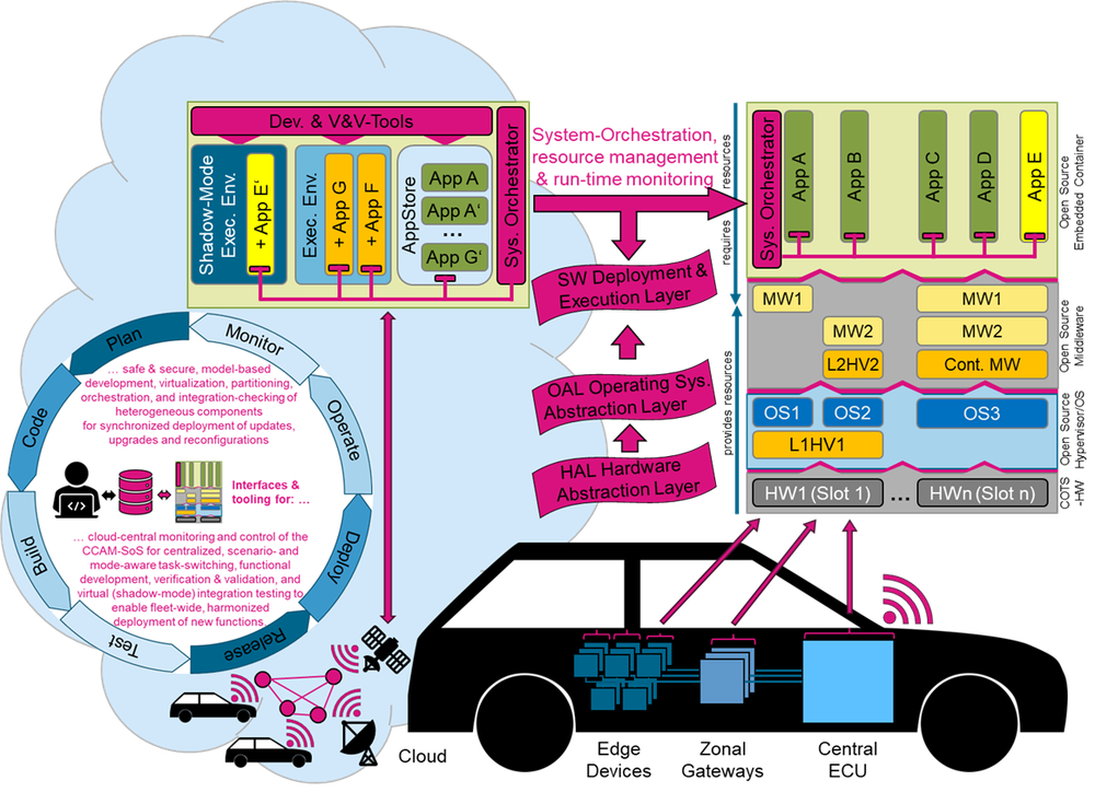 The project is coordinated by DLR and brings together automotive hardware and software manufacturers, small and medium-sized enterprises and research institutions. They are working together to develop a comprehensive ecosystem for software-defined, networked and automated vehicles that can be continuously updated, upgraded and reconfigured. The aim is to create a solution that is integrated into the existing open-source standards of the automotive industry and enables complete abstraction of both the software running in the vehicle and the installed hardware. In this way, software functions can be continuously updated and safely kept up to date throughout the life of the vehicle, while hardware components can be easily replaced or upgraded to meet future requirements. To achieve this, a new hardware component is developed on the basis of established automotive systems and extended in such a way that the unavoidable overhead caused by the update capability is minimised through targeted hardware support.