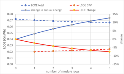 The figure above shows the results of the evaluation. Depending on the number of CPV rows installed, up to 12 per cent more energy can be generated per year by using the otherwise lost scattered radiation. Extracting the LCOE of the CPV subsystem results in a range that starts at around 0.02 euros per kilowatt hour and rises to around 0.024 euros per kilowatt hour if more CPV modules are installed in less irradiated regions further away from the opening. This is an attractive cost level for the additional power. With the additional cost of the CPV subsystem, the LCOE cost of the hybrid system is reduced by up to 7.5 per cent.