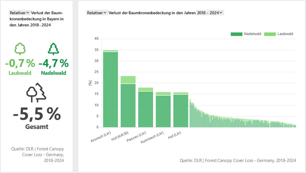 However, climate change and the increasingly hot and dry summers of recent years are placing significant stress on forest ecosystems. The consequences include reduced growth, thinning canopies, increased pest infestations, and rising tree mortality. Weakened forest stands are also more susceptible to wind and snow damage. Spruce, still widely cultivated in monocultures in Bavaria, is particularly vulnerable to drought and secondary damages such as bark beetle infestations. But beech, pine, and oak are also facing growing challenges.