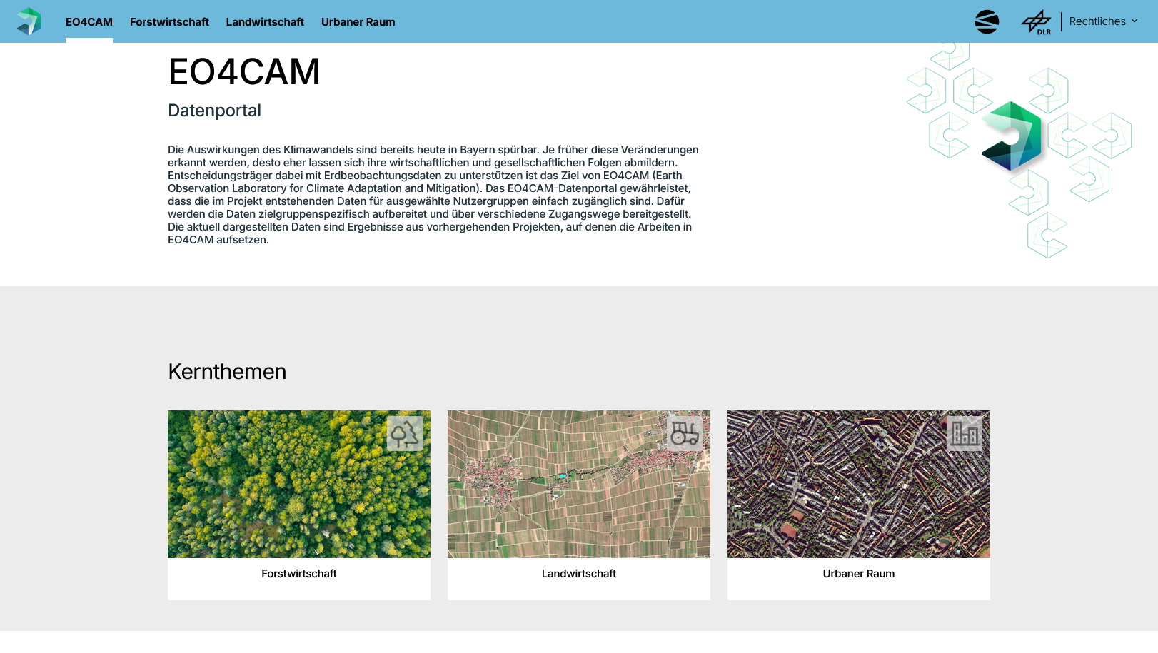The portal is built on a powerful geospatial data infrastructure, which forms the backbone of the system. This infrastructure hosts the project’s entire data collection and provides standard interfaces for direct access. To enable citation in scientific publications and other contexts, the infrastructure also provides Digital Object Identifiers (DOIs), enhancing the findability and traceability of the project’s results. The portal’s user interface displays the data from the infrastructure directly in the web browser. It draws on experience and technologies from numerous other DLR research projects, ensuring intuitive use and modern presentation of the results. EO4CAM outputs can easily be shared via social media or presented live at conferences.