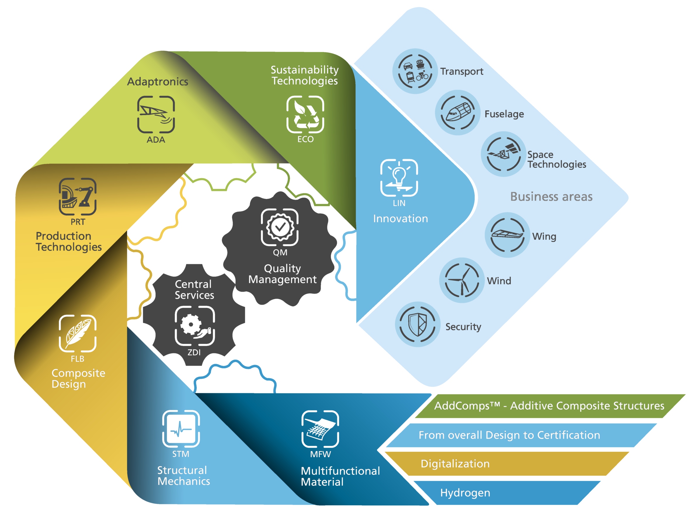 On the side of basic university research, we are connected through partnerships, lectureships and co-operations with the Technical University of Braunschweig, Otto von Guericke University Magdeburg, Clausthal University of Technology, the University of Bremen and Delft University of Technology. On the application-oriented research side, the creation of the Centre for Lightweight Production Technology (ZLP) in Stade, involvement in a customer centre with Airbus and the Virtual Product House (VPH) in Bremen and active participation in the DLR research wind farm also ensure proximity to industrial customers. The Institute is also involved in a small aircraft platform in Aachen-Merzbrück and supports the development of unmanned vehicles in Cochstedt. The Institute also cooperates with certification authorities and with research institutions worldwide as part of international research programmes. The organisation of the institute is described in more detail in the following sections.