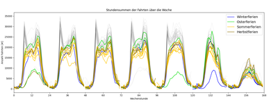 Number of trips in Cologne per hour spread over a week (weekly hydrographs). All 52 weeks of the year 2022 are shown, with the weekly hydrographs during the winter, Easter, summer and autumn holidays highlighted in colour, each showing clearly different patterns. The data is based on Telekom data.