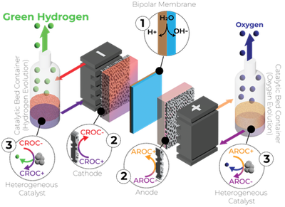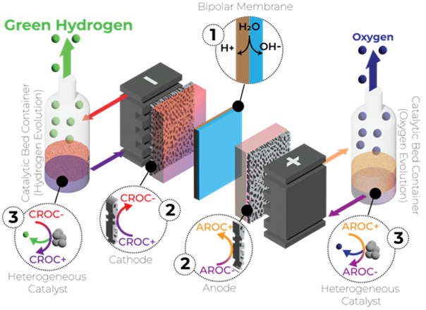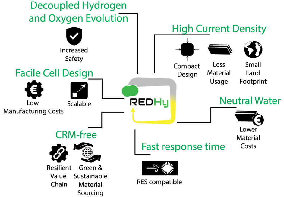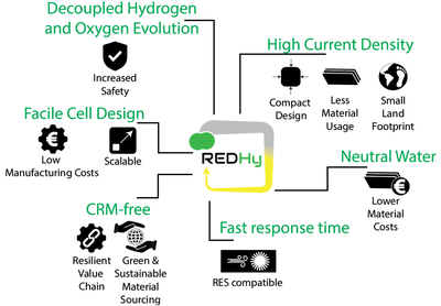 The REDHy system is based on the principle of the redox flow battery. Redox mediators are used as the electrolyte. The innovative approach is to separate hydrogen and oxygen production in a three-stage process. The three stages are divided into 1) water dissociation, 2) electrical storage and 3) green hydrogen and oxygen production via a heterogeneous chemical reaction. Through the water dissociation step and the redox mediator reactions, REDHy bypasses the electrochemically inert water splitting process, resulting in lower overvoltage and low-cost materials. Costs can be reduced by avoiding the use of critical raw materials such as titanium and platinum. The system should also allow the use of seawater.