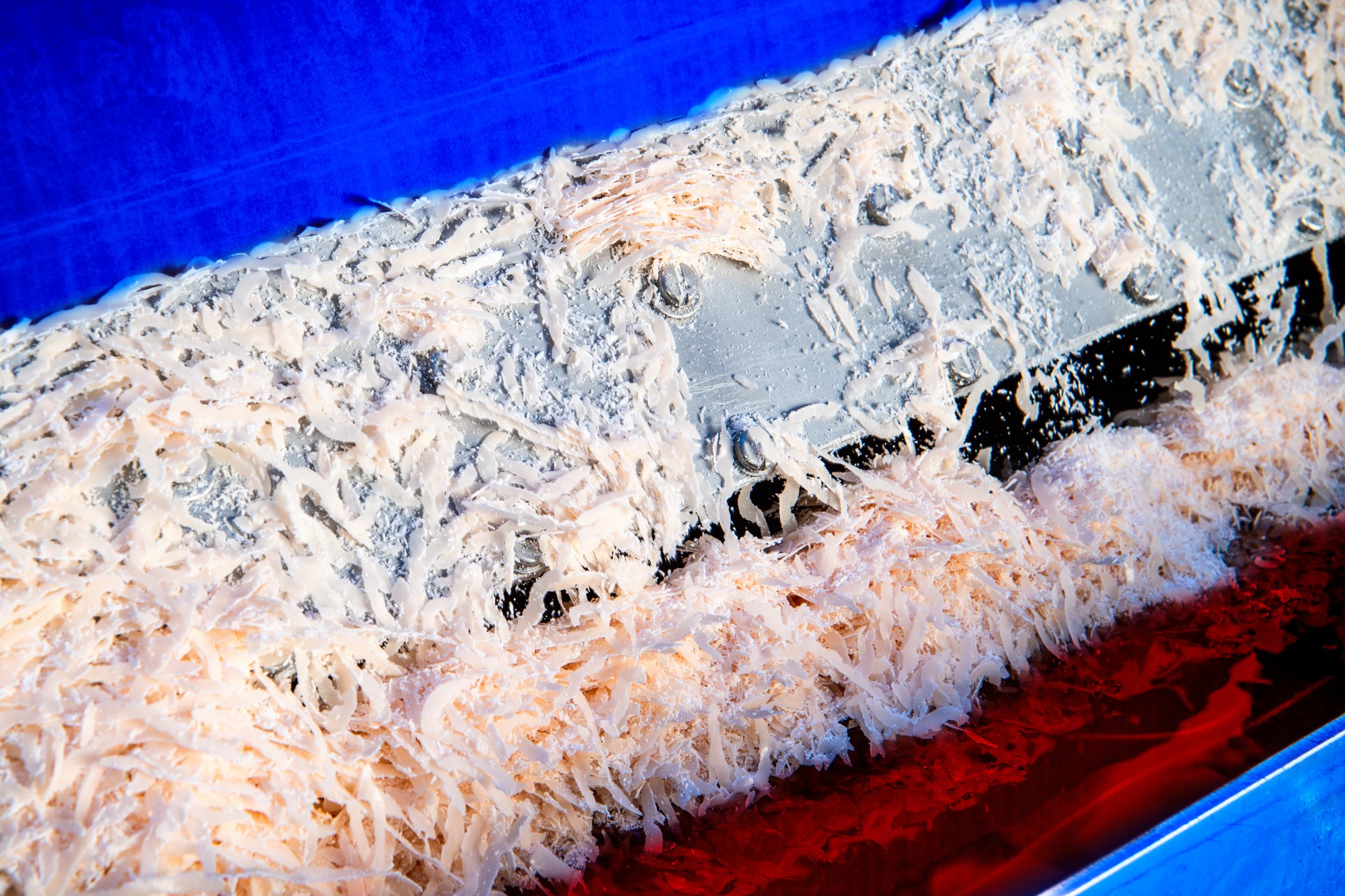 The solid material is separated from the liquid material by rotation and scraped off the surface of the drum by a scraper and falls into a second "cold" storage tank.