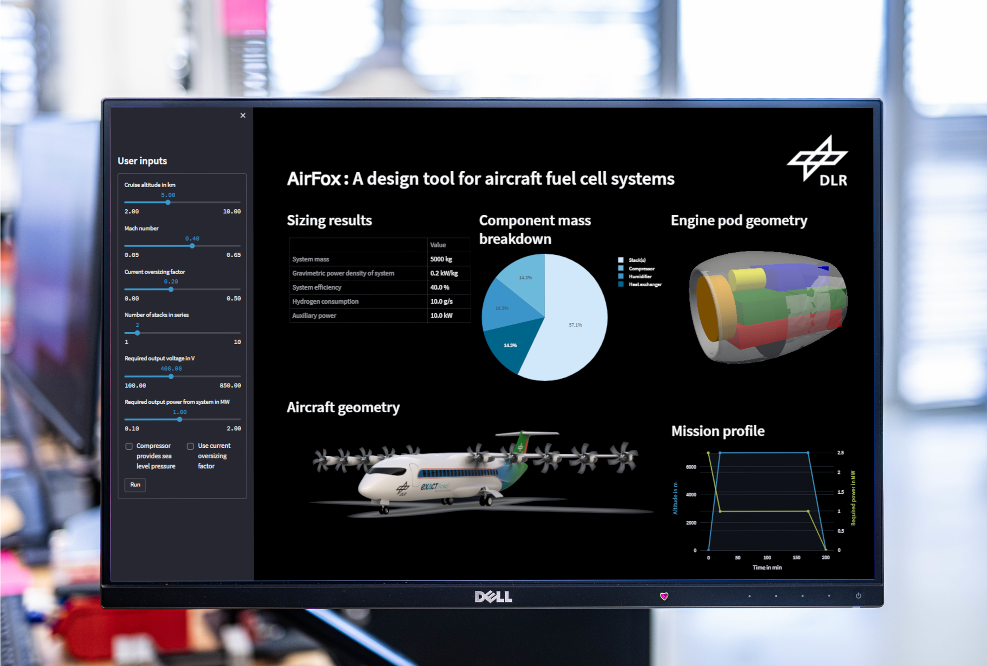 Graphische Benutzeroberfläche des Airfox, mit den wichtigsten Benutzereingaben auf der linken Seite und den interessantesten Ergebnissen auf der rechten Seite. Frühes Entwicklungsstadium.