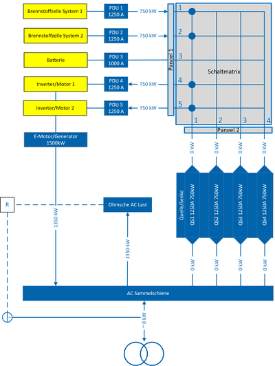 Flexible wiring is necessary so that the main components can be tested individually and in different combinations. The main components such as the fuel cell and battery system as well as the drive system with the inverters work with direct current. In order to be able to operate the components individually, three source/sink modules are available that either draw alternating current from the public power grid and convert it into direct current to supply the components or feed the direct current of the components into the power grid as alternating current.