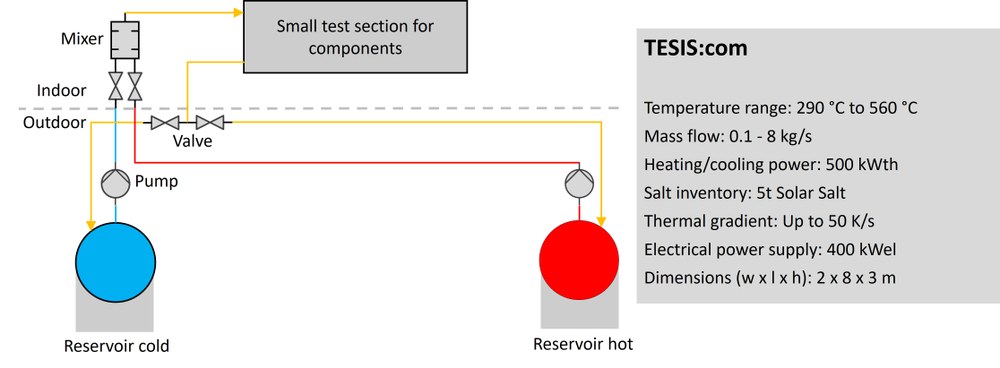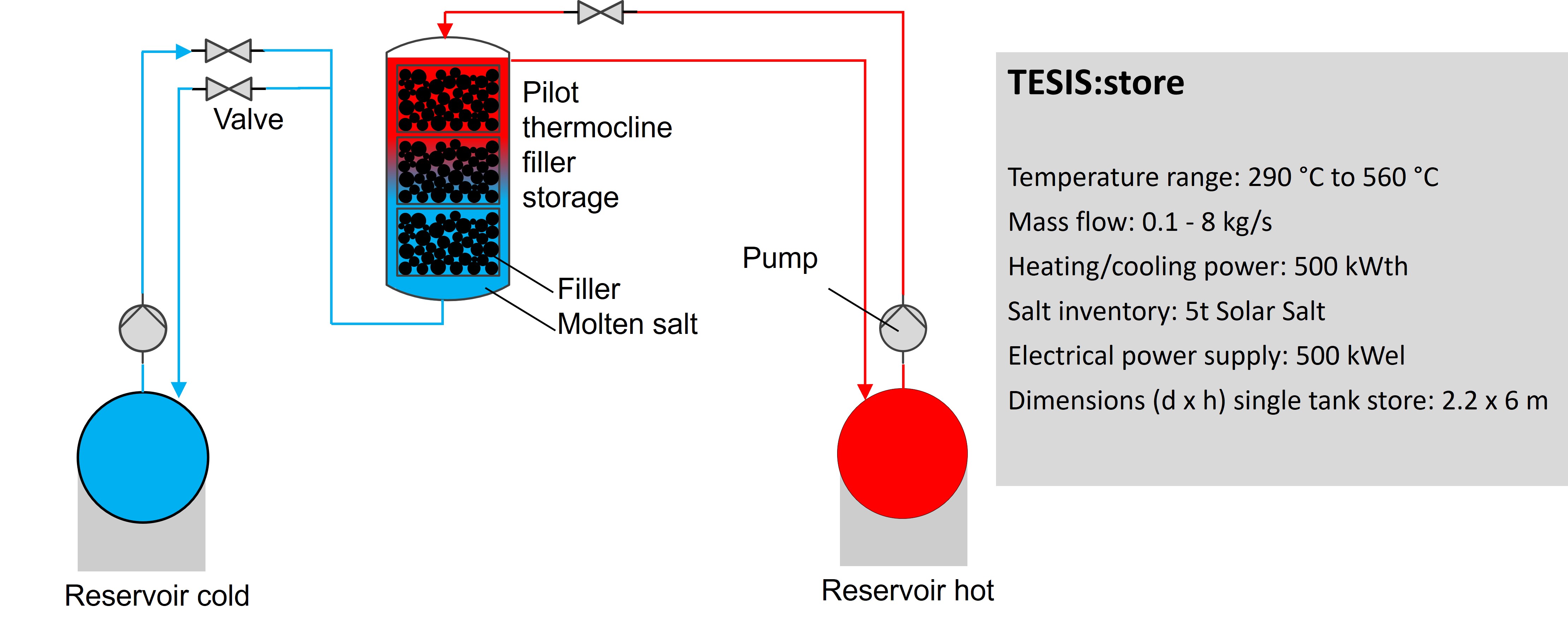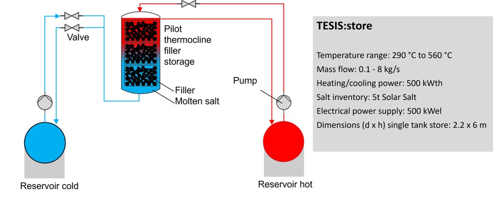 The Test Facility for Heat Storage in Molten Salt (TESIS) at the DLR Institute of Engineering Thermodynamics in Cologne is the first large-scale research facility in Germany in which molten salt storage facilities and associated technologies are investigated on a relevant scale. It is used to develop new storage technologies and to improve materials, components and processes for the use of molten salt storage systems in the field of renewable energies.