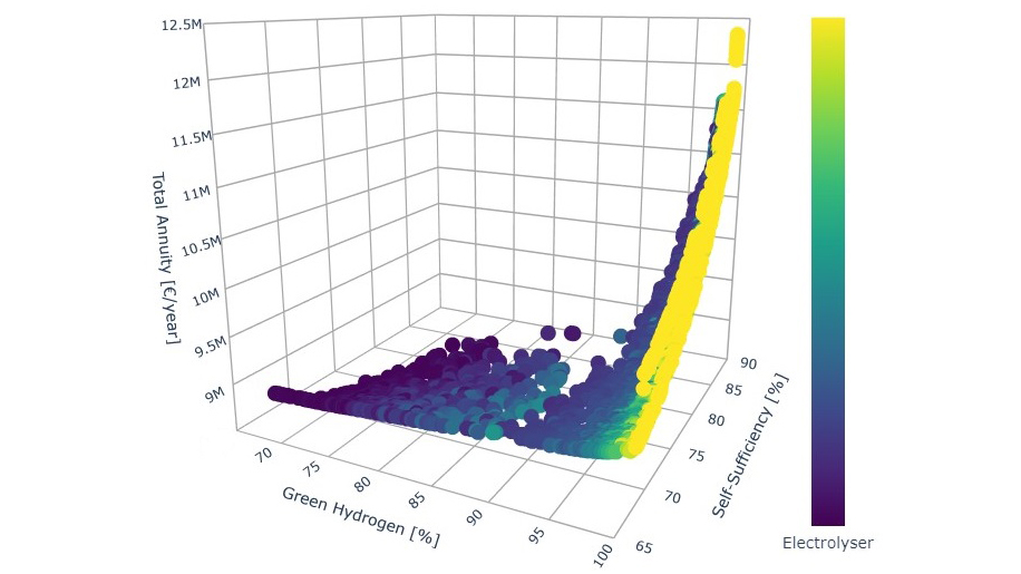 "Our results on design optimisation can be displayed as 3D plots," explains Rabea Weil, SYSTOGEN100 project leader at the Institute of Networked Energy Systems. "This allows us to illustrate directly how measurable key performance indicators – such as economic viability, hydrogen production costs, or self-sufficiency – relate to each other." The freely selectable parameters form a three-dimensional Pareto front from dozens of data points, each representing possible solution options. Simplified, there is no 'right' or 'wrong' – "it's about making an individual selection for the design, such as the size of a planned electrolyser in relation to the available investment volume". This analysis is valuable, for example, for municipal utilities or wind farm operators who plan to store high surpluses from wind and solar energy in hydrogen in the future – instead of curtailing the plants during peak times.