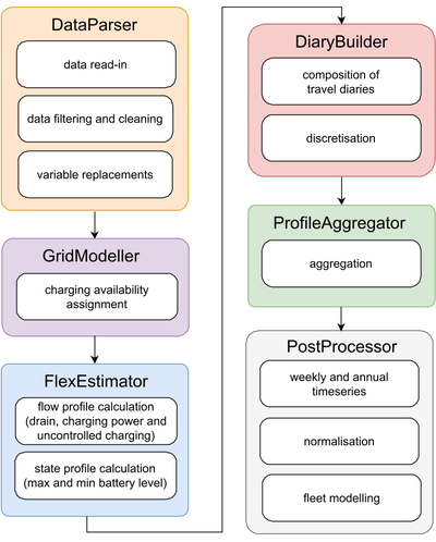 venco.py follows an object-oriented approach containing four main classes in the data pipeline from mobility data to estimated load shifting potentials of electric vehicle fleets. These classes provide a read-in of mobility data sets, the composition of trip and park diaries, the modeling of charging infrastructure at specific parking categories (e.g. home or shopping) as well as the modeling of uncontrolled charging and load shifting.