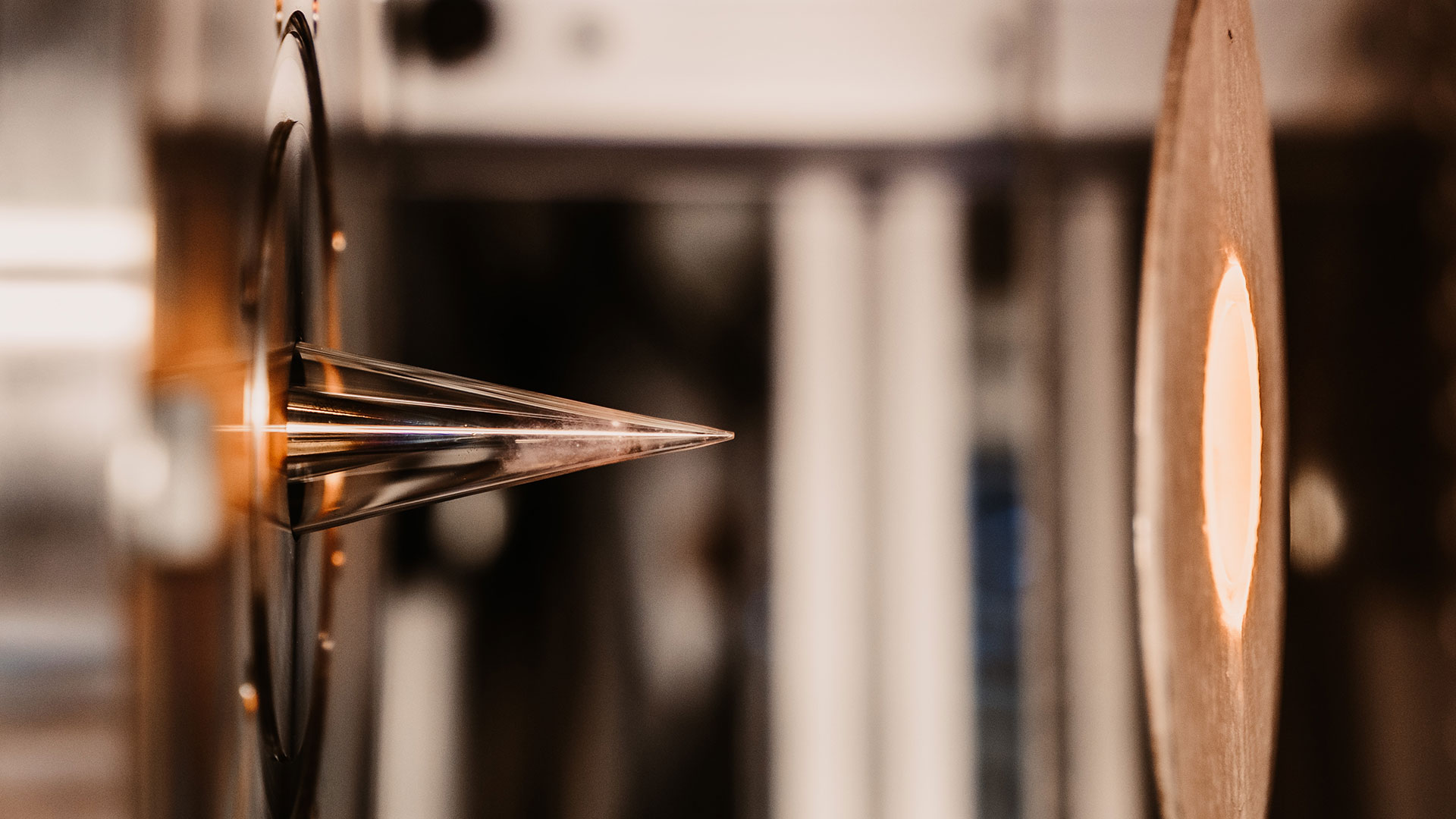 The flow reactor heated to around 1000 degrees in operation: the sampling nozzle can be seen on the left, the outlet of the reactor on the right.