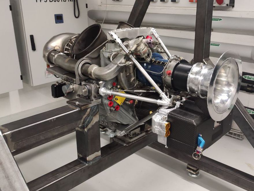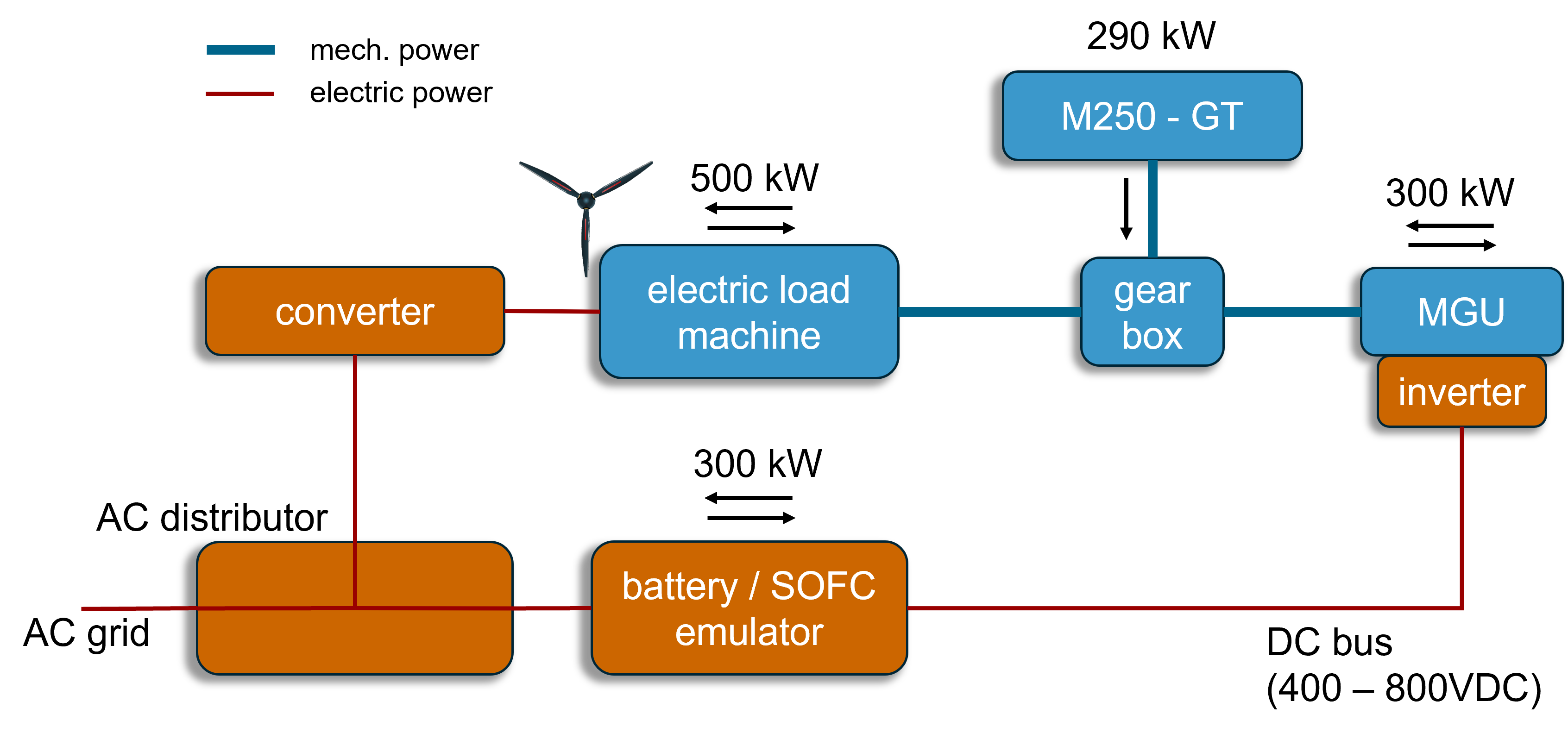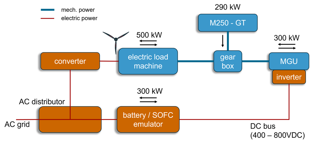 Designed for real flight loads, the gas turbine was coupled with a 300 kW motorgenerator-converter unit (MGU) and modified to form a high-power density gen-set. This enables the test bench to directly generate high-voltage DC power, which is supplied to a programmable battery emulator. Additionally, the load shaft of the gas turbine is coupled to a bidirectional 500 kW load machine, to emulate mechanical loads such as a propeller. The load machine can also accommodate combined loads from the gas turbine and MGU.