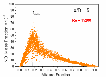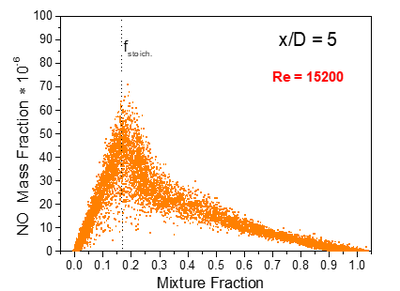 Example of the correlation between NO mass fraction and mixture fraction from Raman/Rayleigh/LIF measurements in the DLR_A jet diffusion flame