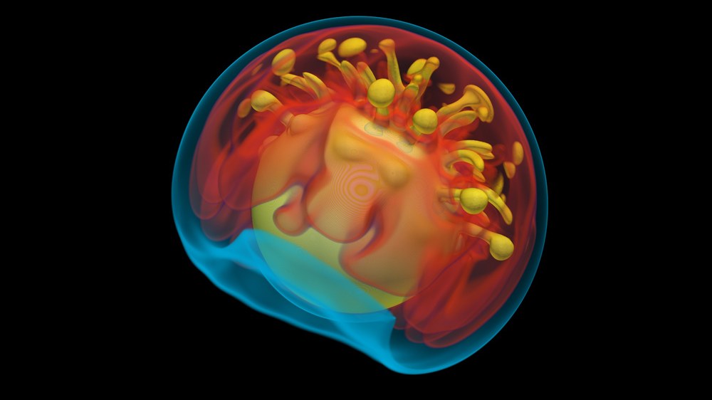 - Hot liquid in a full-sphere (core-convection) under self-gravity cooled at the boundary under a rotating reference frame: Video (left: temperature side-view, right: temperature top view onto rotation axis)